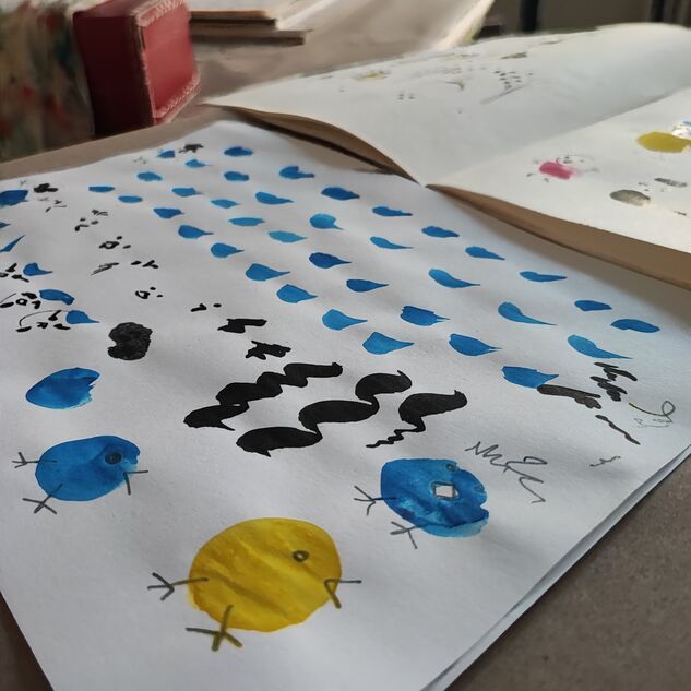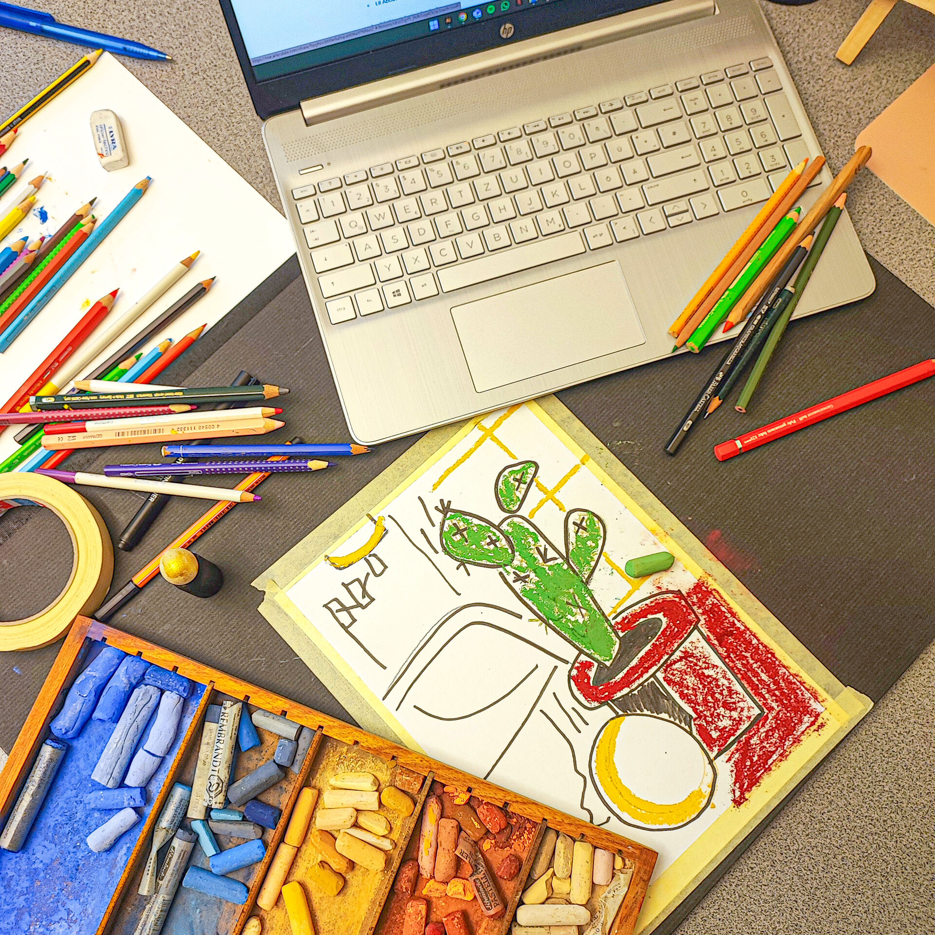 Einfaches Drucker-Papier als Skizzen-Papier ist für alle reichlich vorhanden, ebenso Putz-Lappen, Unterlagen und Wasser-Behälter.
