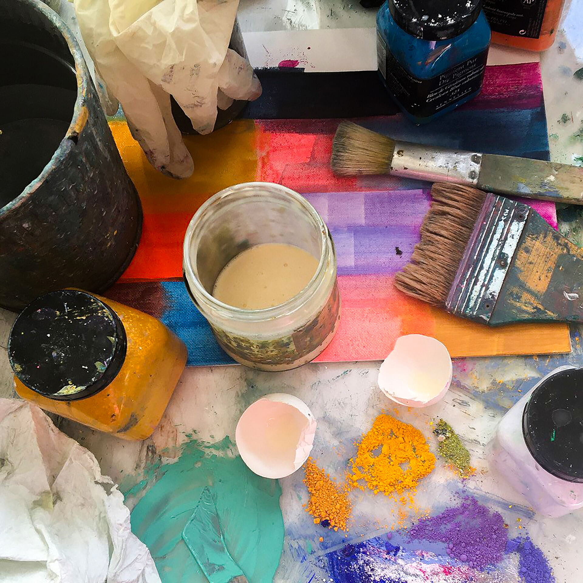 Die Farb-Pigmente werden mit der Ei-Emulsion viel bewusster angerieben, als wenn die Farbe fertig aus der Tube genommen wird.