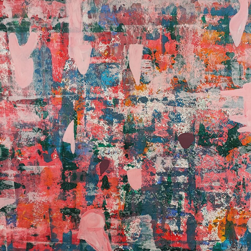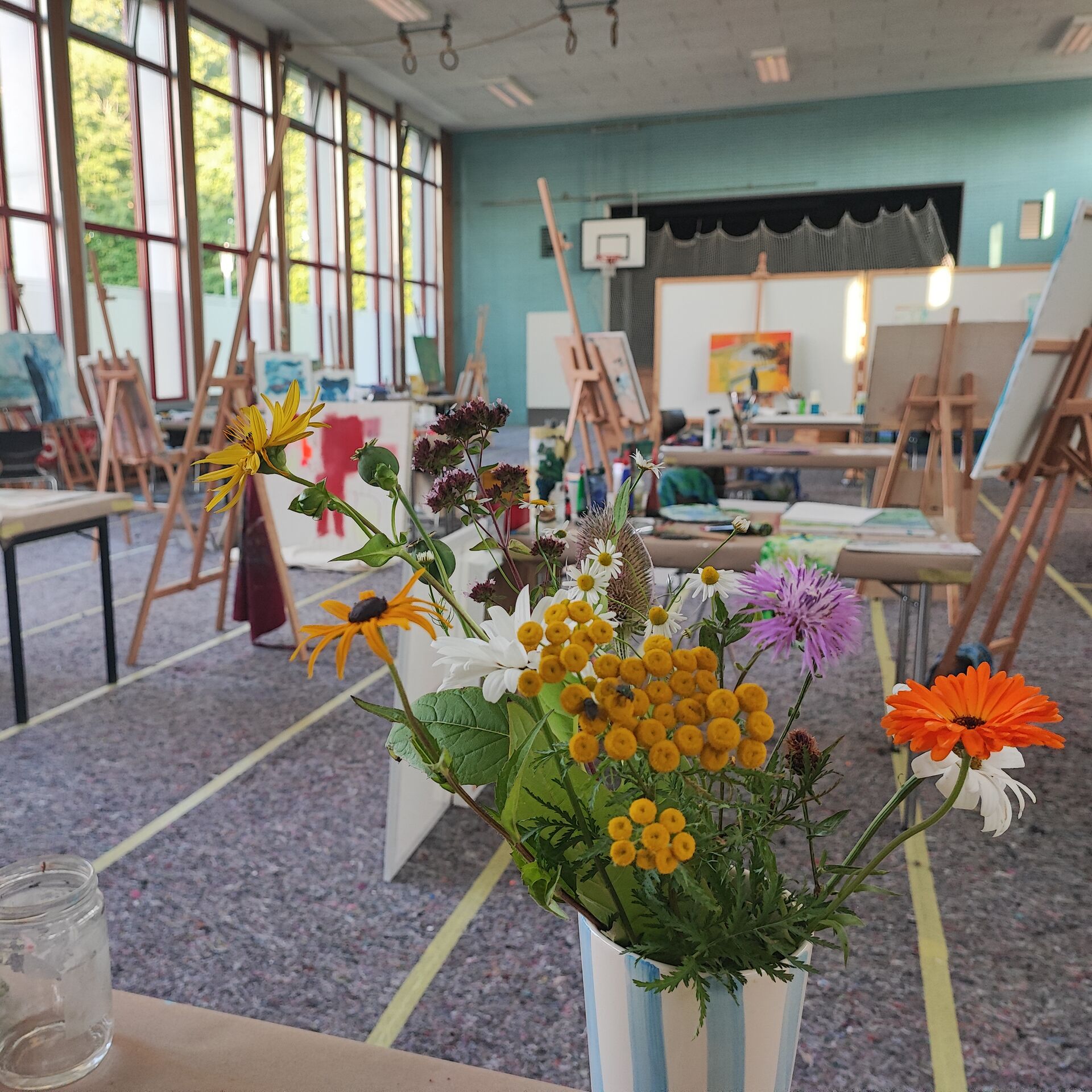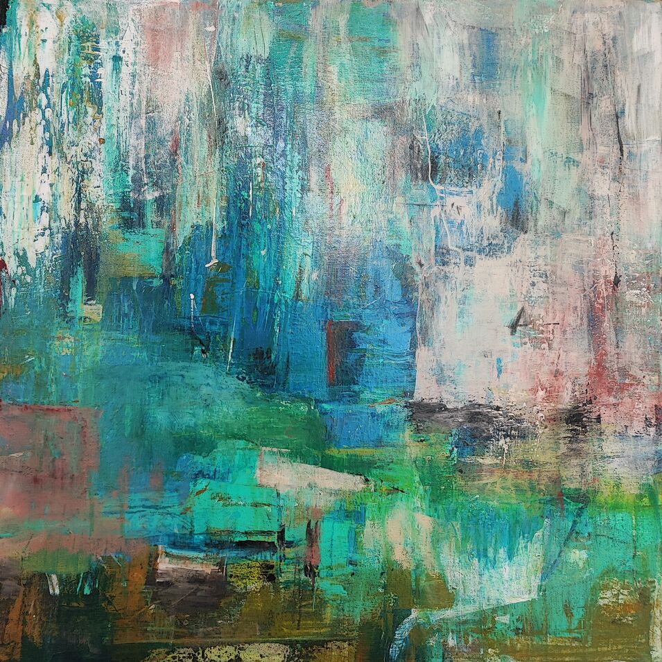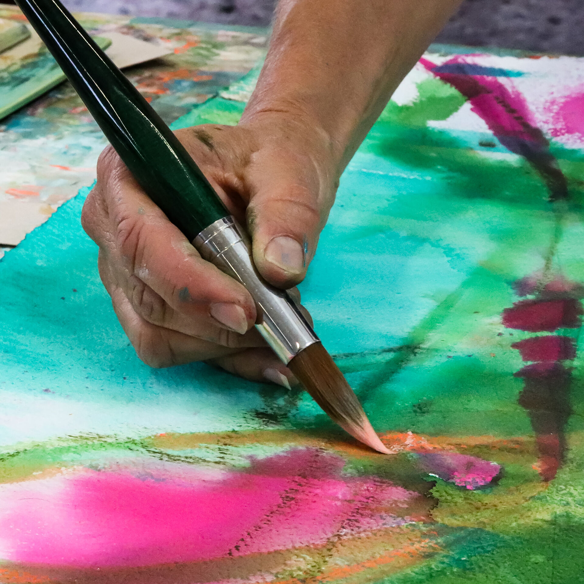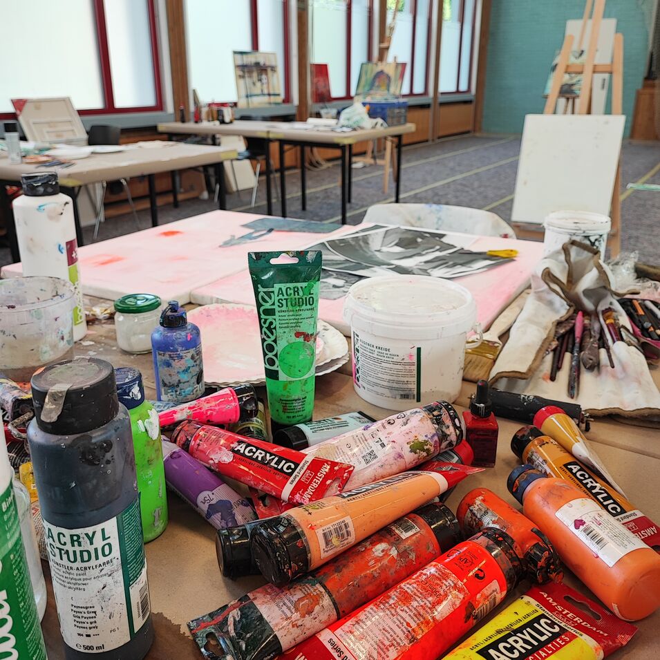 Der Kurs bietet die Möglichkeit, unterschiedliche Techniken auszuprobieren und mit Werkzeugen wie Pinseln, Rakeln, Spachteln und Schwämmen zu arbeiten.