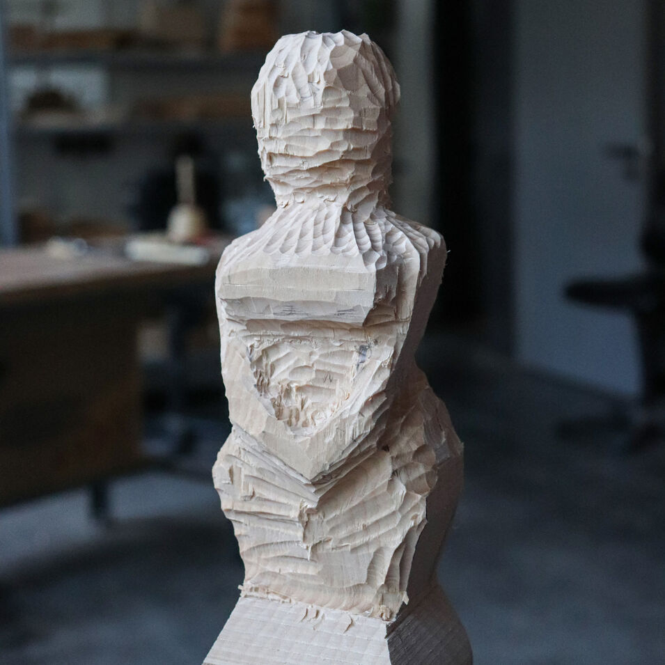 Er vermittelt individuelle bild-hauerische Arbeits-Weisen und zeigt, mit welchen Möglichkeiten das Holz ausgestattet ist und bearbeitet werden kann.