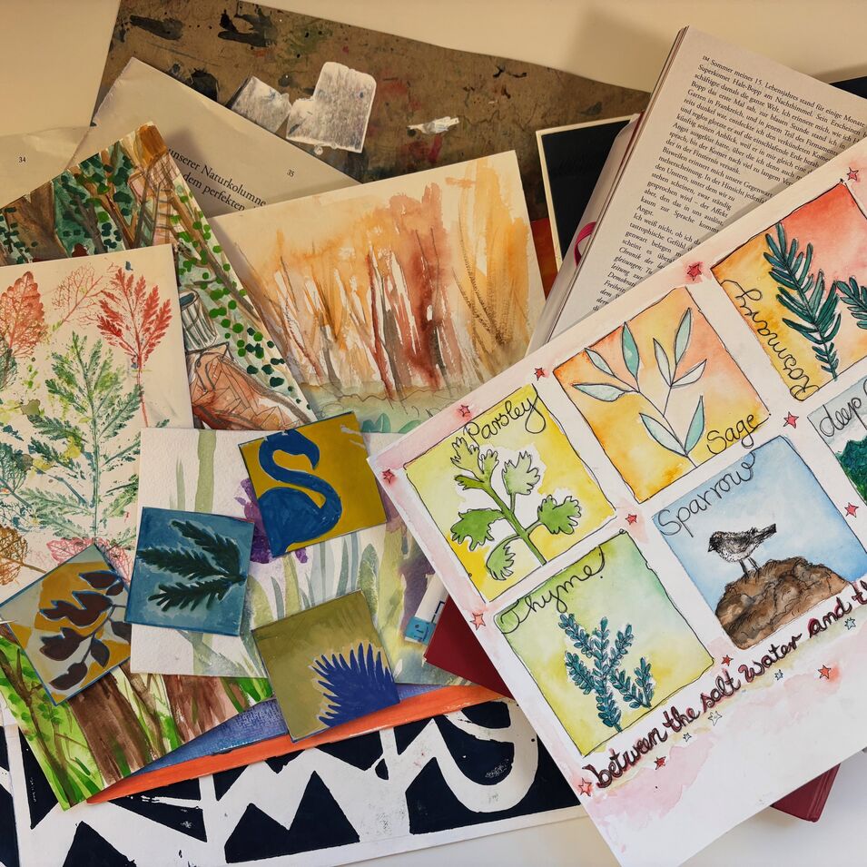 Du kannst die Technik frei wählen und zeichnen, malen, collagieren und kombinieren.